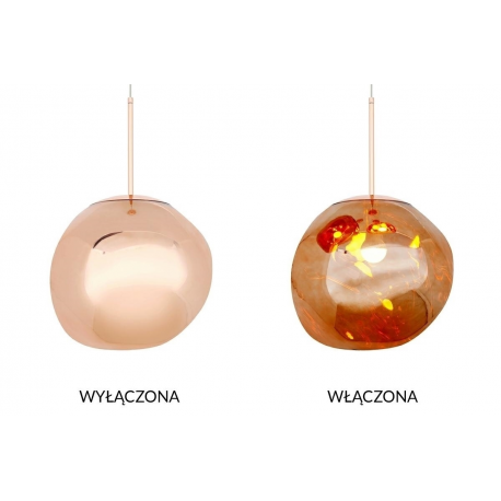 Lampa Fusion 30, kształtem przypomina roztopioną szklaną kulę.Podobny efekt można zaobserwować przy produkcji szkła. Kształt jest nieregularny, przez co wzbudza większą ciekawość. Lampa Fusion, ma dwa oblicza. Kiedy jest wyłączona, wygląda jak klasyczna miedziana lampa. Cały jej urok pojawia się po włączeniu. Dzięki temu miedziana powłoka, staje się półprzezroczysta i ukazuje wnętrze lampy. Można dostrzec żarówkę, przysłoniętą szklaną pajęczyną. Całość wygląda jak żywioł, zamknięty w akrylowej kuli.Światło: E27 max. 30 W (brak w zestawie)Oprawa: szer. 160 cm / wys. 30 cm / gł. 30 cmMocowanie: wys. 6,5 cm / śr. 10,5 cm Klosz: śr. 30 cmMontaż: instalacja sufitowaWaga netto: 2 kgWymiary opakowania: 35 cm / 35 cm / 33 cm.