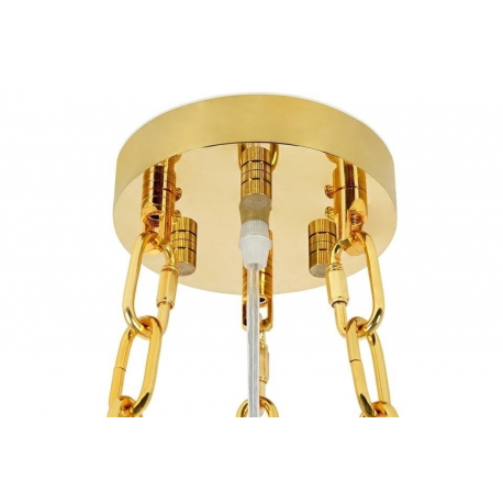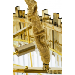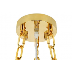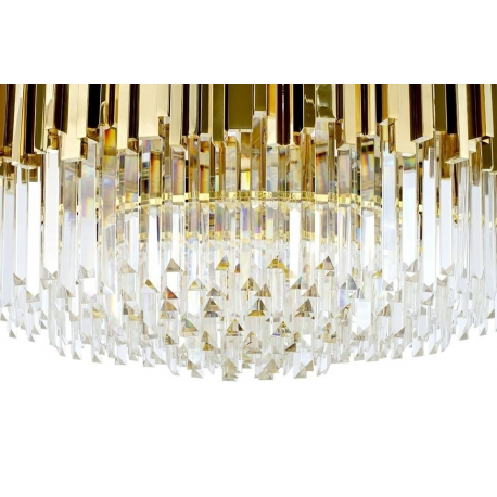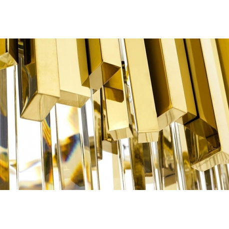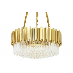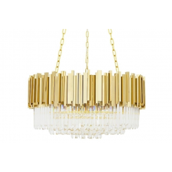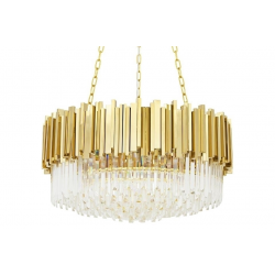 Lampa wisząca Imperial Gold 80.Elegancka osłona klosza wykonana została ze stali szczotkowanej w złotym kolorze.Osłona została zrobiona z zamkniętych profili co dodatkowo podkreśla staranność wykonania.Wewnątrz zawieszone są kryształki, które skrywają źródło światła.Całość zamocowana jest na złotej podsufitce.Okrągły kształt lampy, połączenie złota i szklanych kryształków zapewniają optymalne oświetlenie pomieszczenia.Imperial doskonale sprawdzi się we wnętrzach w stylu glamour.Światło: 16 x E14 max 40 W (brak w zestawie)Oprawa: wys. 40 cm / szer. 80 cm / gł. 80 cmMontaż: instalacja sufitowaWaga netto: 29 kgWymiary opakowania: 1) 82 cm / 82 cm / 30 cm2) 35 cm / 35 cm / 17 cmSposób wysyłki: paleta.