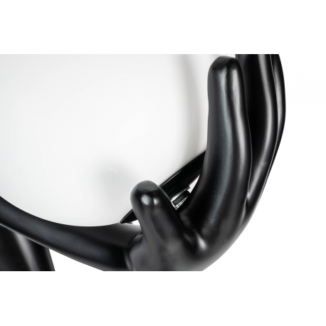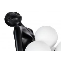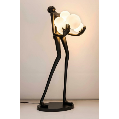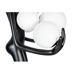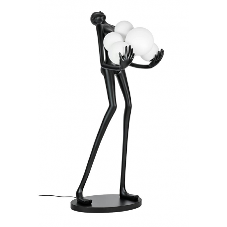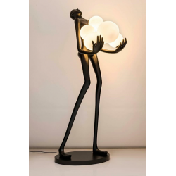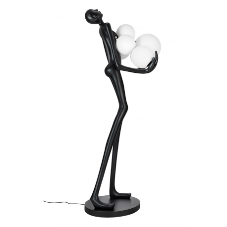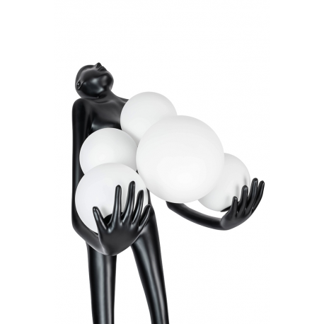 Lampa podłogowa HUMAN.Wykonana z włókna szklanego w kolorze czarnym z sześcioma białymi kloszami w różnych rozmiarach.Stworzony kontrast kolorystyczny idealnie współgra z jej oryginalnym kształtem.Sylwetka człowieka utrzymująca ciężar światła staje się główną dekoracją każdej przestrzeni.Z powodzeniem przykuje uwagę nie tylko miłośników designu.Na kloszu mogą wystąpić pęcherzyki powietrza, które są naturalnym efektem ręcznej obróbki szkła. Światło: 6 x E27 max 30 W (brak w zestawie)Oprawa: wys. 180 cm / szer. 80 cm / gł. 60 cmKlosz: śr. 1 x 25 cm / śr. 1 x 20 cm / śr. 4 x 17 cmPodstawa: szer. 70 cm / gł. 45 cmMontaż: instalacja podłogowa.Waga netto: 30 kgWymiar opakowania: 200 cm / 78 cm / 78 cm.Sposób wysyłki: paleta.