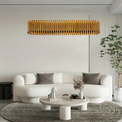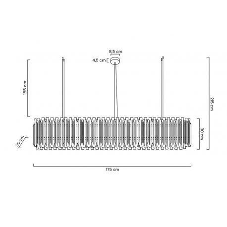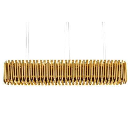 Lampa wisząca Galliano Long.Elegancka osłona klosza wykonana została ze stali węglowej w kolorze ciemnego złota.Osłona to dwa rzędy zamkniętych rurek, które inspirowane są organanami. Pomiędzy rzędami, ukryto źródła światła. Takie rozwiązanie, dodatkowo podkreśla staranność wykonania całej lampy. Całość zamocowana jest na podsufitce w kolorze lampy i stalowych linkach. Owalny kształt lampy w połączeniu z modnym miedzianym kolorem, zapewniają elegancka i praktyczną kompozycję. Galliano Long doskonale sprawdzi się w jadalni, salonie oraz przestrzeniach restauracyjno-hotelowych.Światło: 14 x E14 max. 40 W (brak w zestawie)Oprawa: wys. 200 cm / szer. 172 cm / gł. 30 cmMontaż: instalacja sufitowaWaga netto: 18 kgWymiary opakowania: 177,5 cm / 36,5 cm / 36,5 cmSposób wysyłki: paleta.