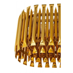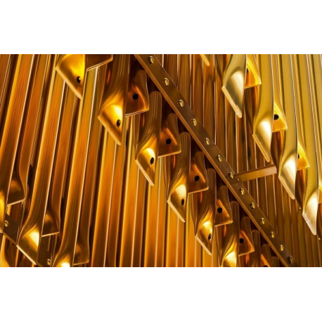 Lampa wisząca Galliano Long. Elegancka osłona klosza wykonana została ze stali węglowej w kolorze ciemnego złota. Osłona to dwa rzędy zamkniętych rurek, które inspirowane są organanami. Pomiędzy rzę