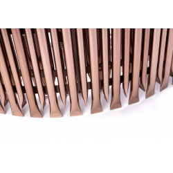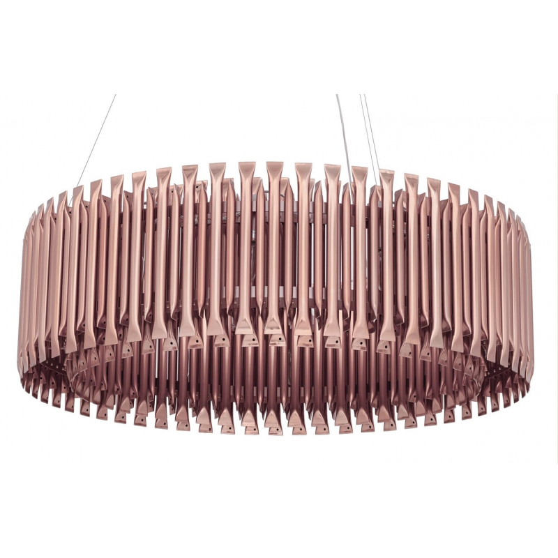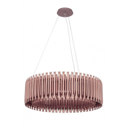 Lampa wisząca Galliano. Elegancka osłona klosza wykonana została ze stali węglowej w kolorze miedzianym. Osłona to dwa okręgi zrobione z zamkniętych rurek, których kształt inspirowany był organami.