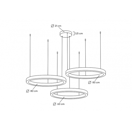 Lampa wisząca RING 60+80+80 złota.Połączenie nowoczesnych, eleganckich i bestselerowych opraw w dowolnych konfiguracjach na jednej podsufitce.Lampy Ring wykonano ze stali nierdzewnej w kolorze złotym i akrylowych osłon źródła światła.Kaskadowo zawieszone na metalowych linkach zapewnią optymalne oświetlenie oraz niezwykłe wrażenie wizualne.Światło: 1 x LED 38 W / 3040 lm / 3000 K, 2 x LED 50 W / 4000 lm / 3000 K (możliwość odpłatnej zmiany barwy światła na 4000 K)Oprawa: wys. 200 cm / szer. 160 cm / gł. 160 cmKlosz: 1 x wys. 5,7 cm / 1 x śr. 60 cm, 2 x wys. 5,7 / 2 x śr. 80 cmMontatura: wys. 3,5 cm / śr. 21 cmMontaż: instalacja sufitowa.