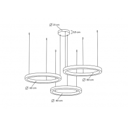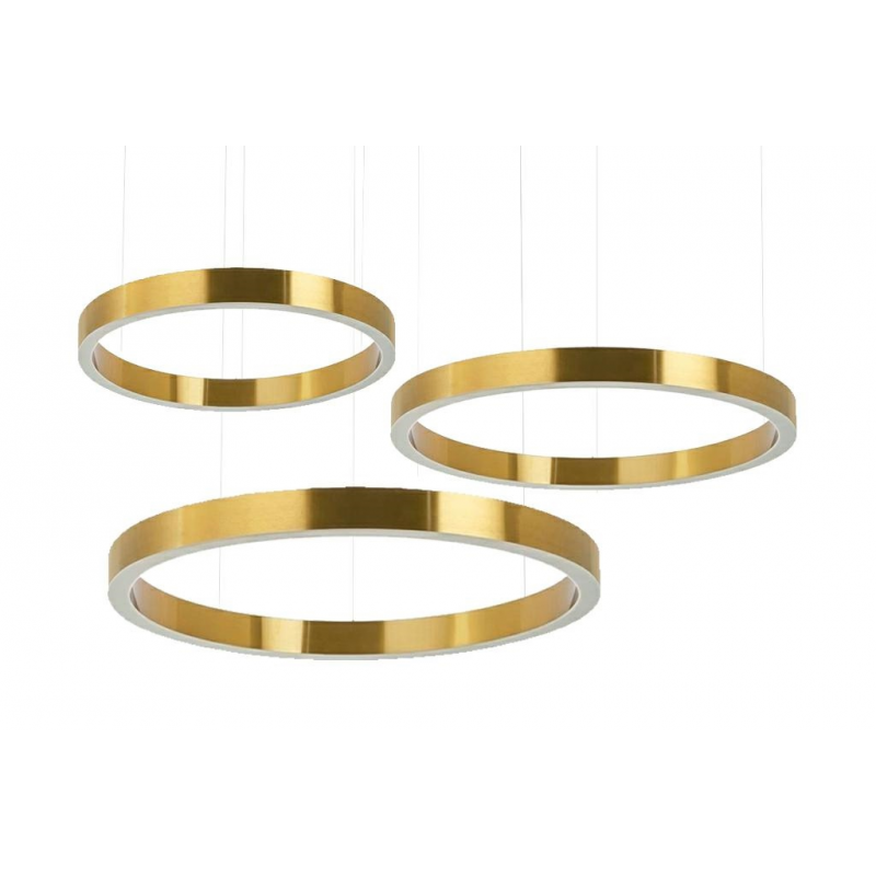 Lampa wisząca RING 40+60+80 złota.Połączenie nowoczesnych, eleganckich i bestselerowych opraw w dowolnych konfiguracjach na jednej podsufitce.Lampy Ring wykonano ze stali nierdzewnej w kolorze złotym i akrylowych osłon źródła światła.Kaskadowo zawieszone na metalowych linkach zapewnią optymalne oświetlenie oraz niezwykłe wrażenie wizualne.Światło: 1x LED 25 W / 2000 lm / 3000 K, 1 x LED 38 W / 3040 lm / 3000 K, 1 x LED 50 W / 4000 lm / 3000 K (możliwość odpłatnej zmiany barwy światła na 4000 K)Oprawa: wys. 200 cm / szer. 140 cm / gł. 140 cmKlosz: 1 x wys. 5,7 cm / 1 x śr. 40 cm, 1 x wys. 5,7 / 1 x śr. 60 cm, 1 x wys. 5,7 / 1 x śr. 80 cmMontatura: wys. 3,5 cm / śr. 21 cmMontaż: instalacja sufitowa.