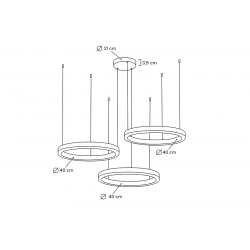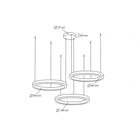 Lampa wisząca RING 40+40+40 złota.Połączenie nowoczesnych, eleganckich i bestselerowych opraw w dowolnych konfiguracjach na jednej podsufitce.Lampy Ring wykonano ze stali nierdzewnej w kolorze złotym i akrylowych osłon źródła światła.Kaskadowo zawieszone na metalowych linkach zapewnią optymalne oświetlenie oraz niezwykłe wrażenie wizualne.Światło: 3 x LED 25 W / 2000 lm / 3000 K(możliwość odpłatnej zmiany barwy światła na 4000 K)Oprawa: wys. 200 cm / szer. 80 cm / gł. 80 cmKlosz: 3 x wys. 5,7 cm / 3 x śr. 40 cmMontatura: wys. 3,5 cm / śr. 21 cmMontaż: instalacja sufitowa.