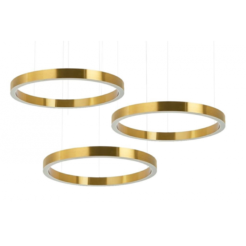 Lampa wisząca RING 80+80+80 złota.Połączenie nowoczesnych, eleganckich i bestselerowych opraw w dowolnych konfiguracjach na jednej podsufitce.Lampy Ring wykonano ze stali nierdzewnej w kolorze złotym i akrylowych osłon źródła światła.Kaskadowo zawieszone na metalowych linkach zapewnią optymalne oświetlenie oraz niezwykłe wrażenie wizualne.Światło: 3 x LED 50 W / 4000 lm / 3000 K (możliwość odpłatnej zmiany barwy światła na 4000 K)Oprawa: wys. 200 cm / szer. 160 cm / gł. 160 cmKlosz: 3 x wys. 5,7 cm / 3 x śr. 80 cmMontatura: wys. 3,5 cm / śr. 21 cmMontaż: instalacja sufitowa.