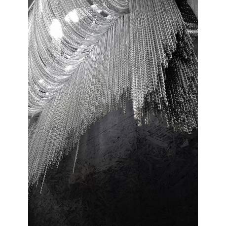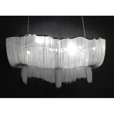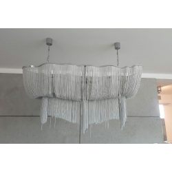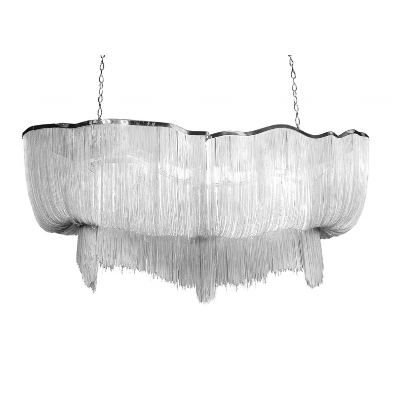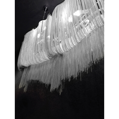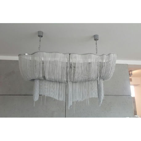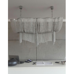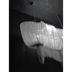 Atlanta Long to niezwykła lampa wisząca, inspirowana projektem Terzani Atlantis posiada nieregularne kształty, niczym fale oceanu. Została wykonana z aluminium i stalowych, drobnych łańcuchów, dzięki którym światło jest przyjemnie rozproszone, a sama lampa wygląda ekskluzywnie ielegancko. W środku lampy znajduje się aż 10 mocowań na żarówki, co daje całkiem intensywne i równomierne oświetlenie.Lampa Atlanta pasuje zarówno do salonów, czy sypialni, jak również do wszelkich stylowych przestrzeni,takich jak butiki, salony urody, czy hotele.Oprawa: wys. 250 cm / szer. 160 cm / gł. 40 cmMontaż: instalacja sufitowa.