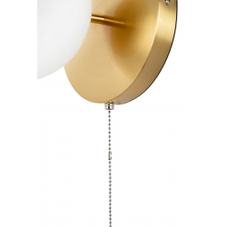 Lampa ścienna ORO złota.Nowoczesna oprawa wykonana z metalu w odcieniu mosiądzu oraz szklanego, mlecznego klosza.Oro jest niezwykle praktyczna poprzez zastosowanie dekoracyjnego włącznika, którym możemy oświetlić pomieszczenie w dogodnym dla nas momencie.Połączenie kolorystyczne tworzy przytulny klimat, dzięki czemu lampa świetnie sprawdzi się w salonie, czy w sypialni.Światło: E14 max. 40 W (brak w zestawie)Oprawa: wys. 59 cm / szer. 20 cm / gł. 21 cmKlosz szklany: śr. 15 cmŁańcuszek: dł. 40 cmMocowanie: śr. 20 cm / gł. 2,5 cm.