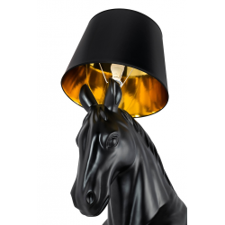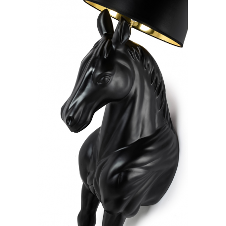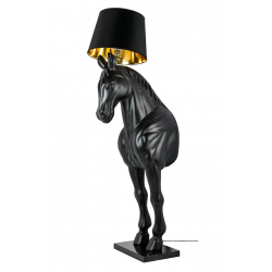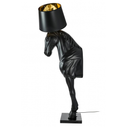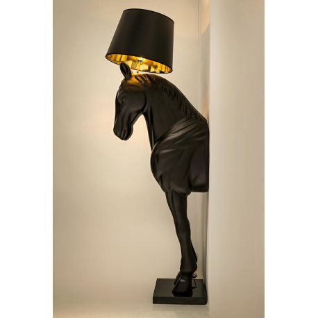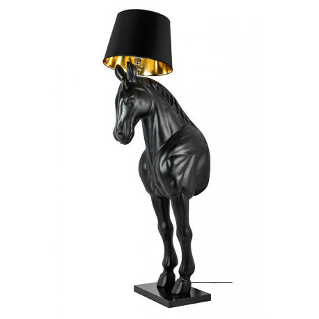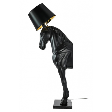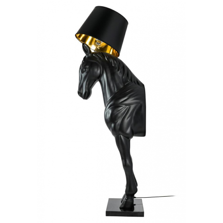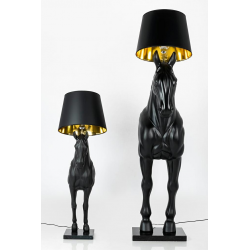Lampa Horse Stand M w kształcie konia.Jeżeli lubisz trochę ekstrawagancji, ta lampa jest dla ciebie. Będzie głównym elementem wystroju każdego pomieszczenia. W całości wykonana została z włókna szklanego w kolorze czarnym,matowym. Abażur wykonany z materiału w dwóch kolorach. Zewnętrzna strona jest czarna i tworzy z lampą całość kolorystyczną. Wewnętrzna jest w kolorze złotym, dzięki czemu lampa świeci przyjemnym ciepłym światłem. Ruchomy klosz umożliwia regulacje kąta padania światła. Całość umieszczono na marmurowej podstawie.Światło: E27 max. 40 W (brak w zestawie)Oprawa: wys. 185 cm / szer. 45 cm / gł. 64 cmKlosz: śr. 45 cm / wys. 32 cmPodstawa: szer. 45 cm / gł. 33 cmPrzewód: 310 cmWaga netto: 30 kgSposób wysyłki: paleta.