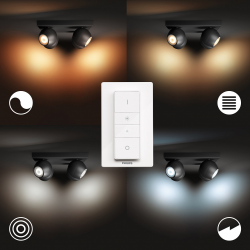 Philips Hue White ambiance Buckram to poczwórne oświetlenie punktowe w kolorze czarnym. Dzięki regulowanym reflektorom lampa może oświetlić każdy zakątek pomieszczenia. Oprawa świeci białym światłem (istnieje możliwość zmiany temperatury barwowej od ciepłej do zimnej).Lampa pozwala na użycie wbudowanych aranżacji świetlnych ułatwiających wykonywanie codziennych czynności. Lampą można sterować za pomocą aplikacji Philips Hue Bluetooth lub mostka Philis Hue. Dodając mostek możesz uzyskać dostęp do większej liczby funkcji inteligentnego oświetlenia.