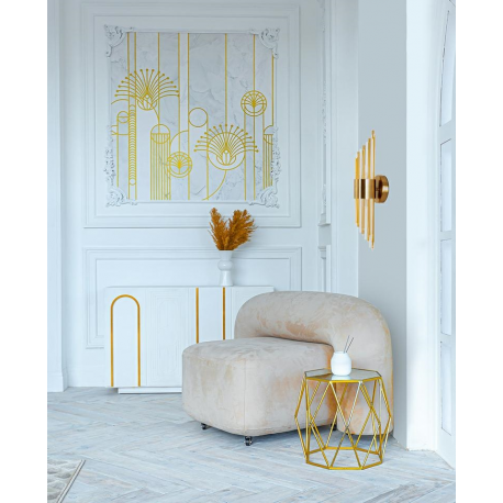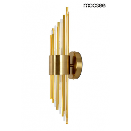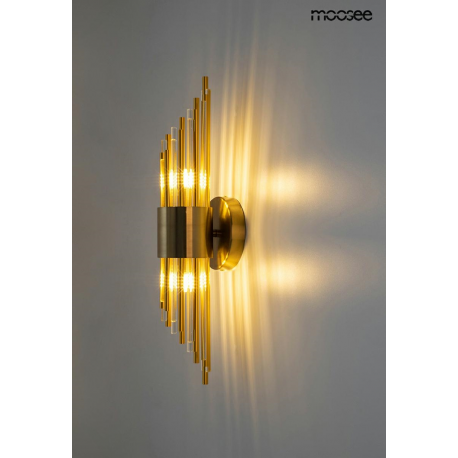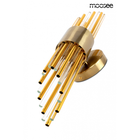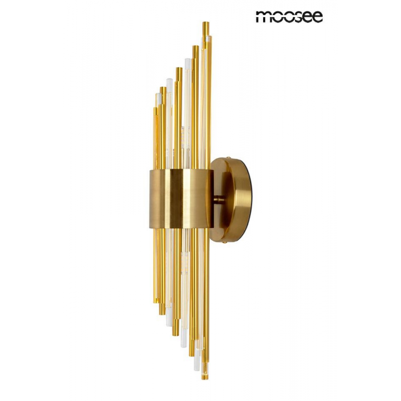 MOOSEE lampa ścienna AMADEO złota. Niezwykle nowoczesny i elegancki kinkiet w stylu glamour. Kryształowe klosze o różnych długościach, przeplatają się z dekoracyjnymi elementami w kolorze złotym, op