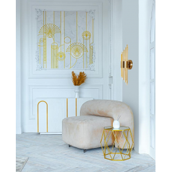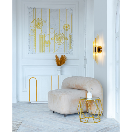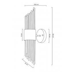 MOOSEE lampa ścienna AMADEO złota.Niezwykle nowoczesny i elegancki kinkiet w stylu glamour. Kryształowe klosze o różnych długościach, przeplatają się z dekoracyjnymi elementami w kolorze złotym, optycznie wydłużając kinkiet. Całość zamontowana na metalowym stelażu w kolorze złotym, a snop światła skierowany jest zarówno w górę, jak i w dół.Światło: 2 x G9 max 25 W (brak w zestawie)Oprawa: wys. 52 cm / szer. 12 cm / gł. 13,5 cmMocowanie: śr. 12 cm / gł. 3 cmElement ozdobny: wys. 8 cmMontaż: instalacja ściennaWaga netto: 2 kgWymiary opakowania: 55 cm / 25 cm / 15 cm.
