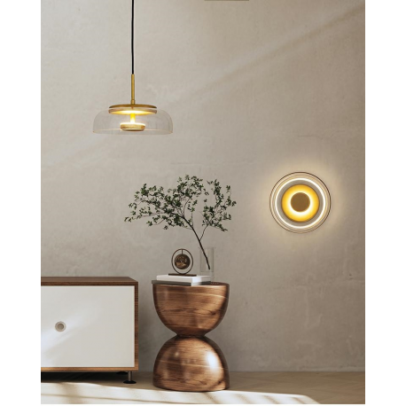 MOOSEE lampa ścienna EDEN WALL złota.Stylowy szklany klosz i metalowa montatura w kolorze złotym sprawiają, że oprawa świetnie sprawdzi się w nowoczesnym wnętrzu, lecz również może zostać ciekawym przełamaniem nieco bardziej surowych aranżacji. Źródło światła skierowane jest w wewnętrzną stronę, dzięki czemu strumień świetlny odbija się od mocowania, tworząc wyjątkowy efekt.Światło: LED SMD 6,5 W / 520 lm / 3000 KOprawa: wys.23 cm / szer. 16 cm / gł. 10 cmKlosz: wys. 7 cm / śr. 23 cmKlosz - złoty LED: śr. 7 cmMocowanie: śr. 10 cm / gł. 3 cmMontaż: instalacja ściennaWaga netto: 0,5 kgWymiary opakowania: 32 cm / 32 cm / 17 cm.*W kloszu mogą wystąpić pęcherzyki powietrza, które są naturalnym efektem powstałym podczas ręcznej obróbki szkła.