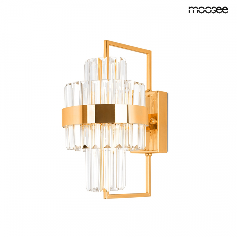 MOOSEE lampa ścienna IMPERO złota. Ten niezwykle szykowny kinkiet doskonale ozdobi wnętrza w stylu Glamour. Głównym elementem dekoracyjnym jest efektowny kryształowy klosz umocowany na prostokątnej
