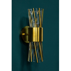 MOOSEE lampa ścienna LORENZO złota.Całość została wykonana ze szkła oraz stali nierdzewnej w szykownym złotym kolorze.Nietypowe ułożenie pod kątem transparentnych kloszy oraz złotych elementów tworzy oryginalny i designerski wygląd.Dzięki nowoczesnej konstrukcji na ścianie powstaje wyjątkowy efekt wizualny.Światło: 2 x E14 max. 40 W (brak w zestawie)Oprawa: wys. 35 cm / szer. 12 cm / gł. 15 cmZłoty element klosza: wys. 9 cmMocowanie: wys. 2,5 cm / śr. 12 cmMontaż: instalacja ściennaWaga netto: 2 kgWymiary opakowania: 41 cm / 23 cm / 15 cm.