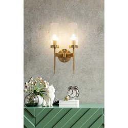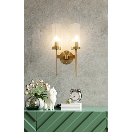 Lampa ścienna TORCH TWIN złota. Elegancki kinkiet przypominający nowoczesne pochodnie w stylu glamour. Oprawa została wykonana ze stali w kolorze złotym, a klosze z efektownego kryształu, które w wy