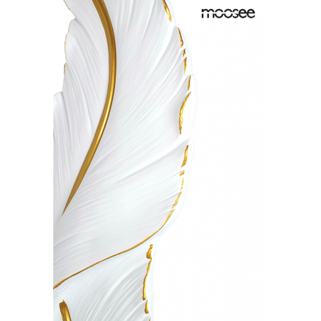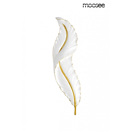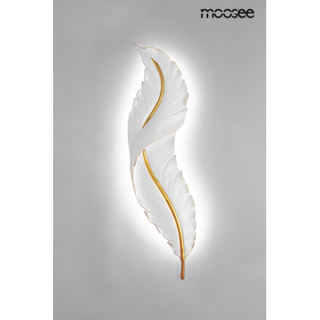 MOOSEE lampa ścienna IKAR 60.Ten niezwykle efektowny kinkiet został zainspirowany opadającym lekkim piórem.Całość ręcznie stworzono z żywicy, dzięki czemu lampa Ikar wygląda bardzo realistycznie.Biało-złote wykończenie dodaje elegancji i klasy.Zarówno użyty materiał, jak i forma lampy sprawiają, iż po włączeniu światło pięknie przenika i tworzy niezapomniany efekt wizualny na ścianie.Dodatkowym atutem jest możliwość zmiany barwy światła na 3 odcienie: zimny, neutralny bądź ciepły.Lampa Ikar to produkt wyjątkowy, który z całą pewnością ozdobi Twoje wnętrze.Dostępna również większa wersja.Światło: LED 11 W / 880 lmOprawa: wys. 62 cm / szer. 18 cm / gł. 6,5 cmMontaż: instalacja ściennaWaga netto: 2 kgWymiary opakowania: 75 cm / 25 cm / 14 cm.