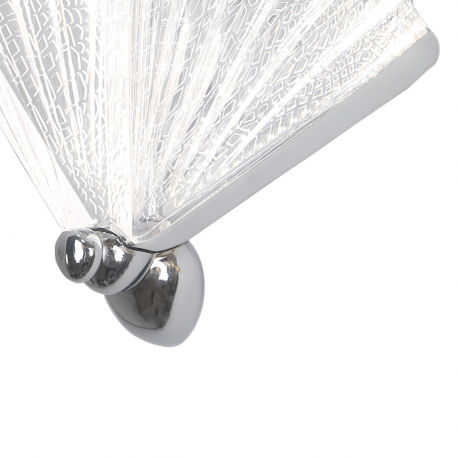 Kinkiet z kolekcji Mariposa to doskonałe uzupełnie lamp wiszących. Kinkiet został wykonany z metalu w kolorze chromu oraz akrylu imitującego szkło. Akrylowe skrzydła kryją w sobie wbudowane światło LED CCT z możliwością wyboru preferowanej barwy światła (ciepłej, zimnej bądź neutralnej).