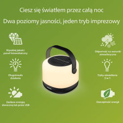 Ta przenośna lampa solarna Philips Alula ma tryby ustawień światła 3 w 1. Wystarczy puknąć lub stuknąć, aby korzystać z dwóch poziomów jasności lub trybu imprezy RG