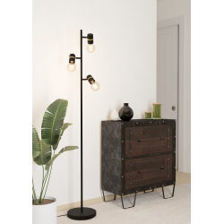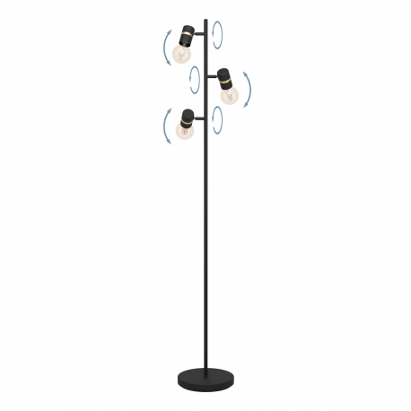 Lampa podłogowa LURONE składa się z czarnej metalowej podstawy, do której przymocowano trzy ruchome metalowe reflektory w tym samym kolorze. Pierścienie w kolorze mosiądzu na głowicach punktowych nadają lampie nowoczesny wygląd. Wygodne włączanie i wyłączanie jest możliwe za pomocą przełącznika nożnego. Lampa podłogowa wtapia się w różne style umeblowania i daje możliwość ustawienia indywidualnych akcentów w pomieszczeniu - czy to w salonie, sypialni czy przedpokoju. Przedstawione żarówki żarowe nie wchodzą w zakres dostawy. Lampa nadaje się do każdej lampy z trzonkiem E27.