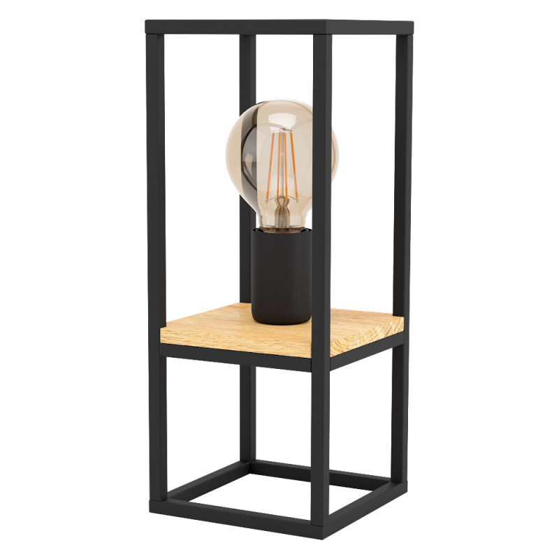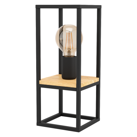 Lampka stołowa serii LIBERTAD. Czarna, metalowa konstrukcja połączona z dekoracyjnym panelem wykonanym z drewna kauczukowego