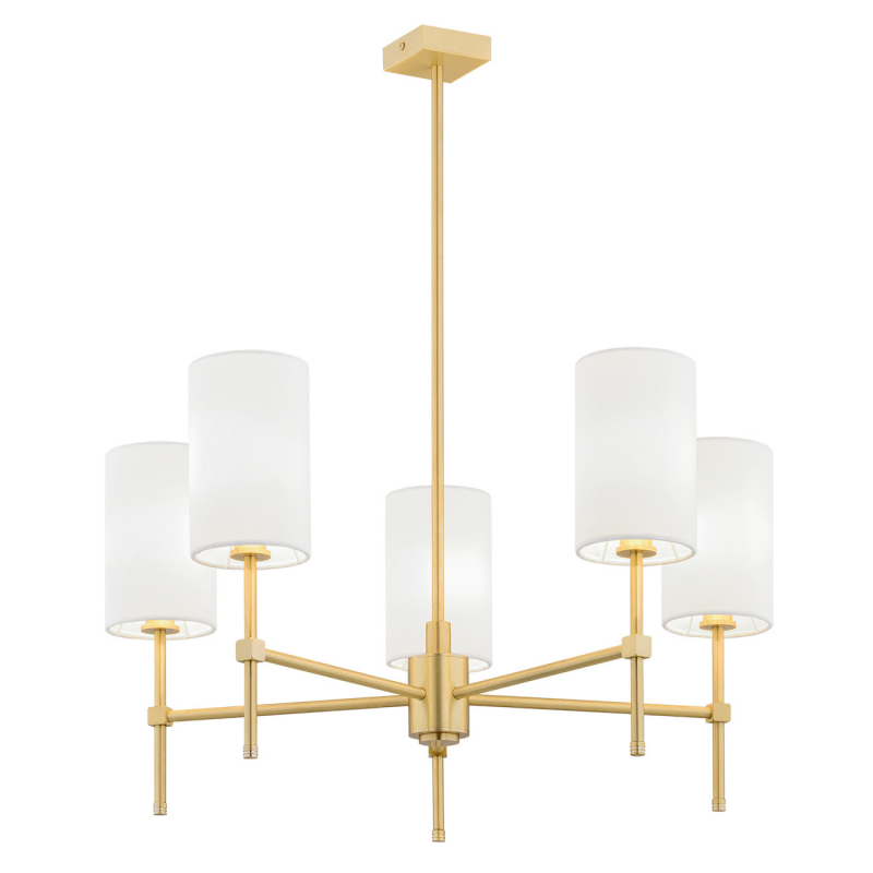 Wyrafinowany żyrandol do salonu. Olbrzymia lampa wisząca z abażurami. Żyrandol pięciopłomienny polskiej produkcji ze stelażem z mosiądzu.Stylowa lampa glamour polskiej produkcji