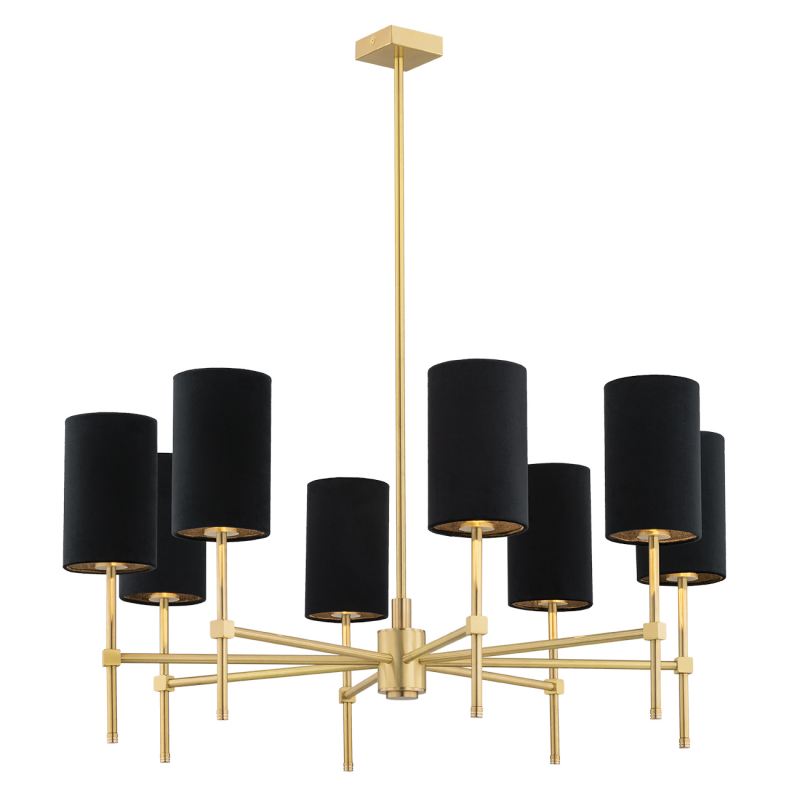 Wyrafinowany żyrandol do salonu. Olbrzymia lampa wisząca z abażurami. Żyrandol ośmiopłomienny polskiej produkcji ze stelażem z mosiądzu.Stylowa lampa glamour polskiej produkcji