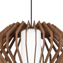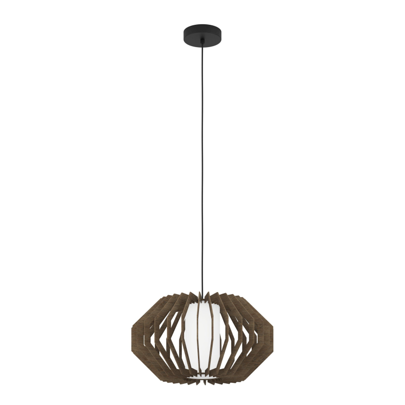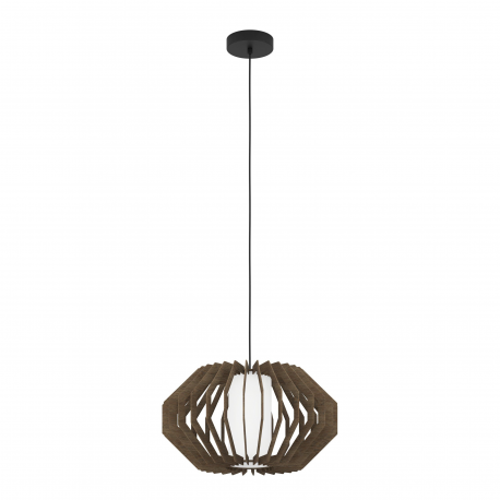 Lampa wisząca RUSTICARIA ma klosz wykonany z brązowych listew drewnianych, który jest zawieszony na metalowym daszku tego samego koloru za pomocą czarnego kabla tekstylnego. Wewnętrzny biały szklany cylinder dopełnia nowoczesny wygląd lampy i zapewnia przyjemne oświetlenie. Dzięki kanciastemu kształtowi lampa wisząca idealnie pasuje do nowoczesnych stylów umeblowania i zapewnia przytulne oświetlenie w salonie lub jadalni nad stołem jadalnym. Żarówka nie wchodzi w zakres dostawy. Lampa nadaje się do każdej lampy z trzonkiem E27.