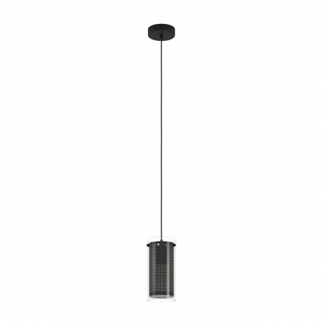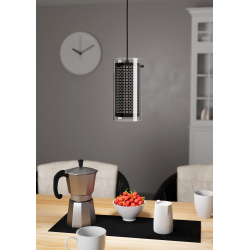Lampa wisząca PINTO TEXTIL 1 składa się z cylindrycznego szklanego klosza, który jest zawieszony na metalowym daszku tego samego koloru za pomocą czarnego kabla tekstylnego. Wewnętrzna czarna tekstylna obudowa ma drobne wycięcia, a po włączeniu tworzy fascynującą grę światła i cienia w pomieszczeniu. Dzięki przytulnemu wzornictwu lampę wiszącą można łączyć z niemal każdym stylem umeblowania i zapewnia nastrojowe oświetlenie w salonie lub jadalni. Żarówka nie wchodzi w zakres dostawy. Lampa nadaje się do każdej lampy z trzonkiem E27.