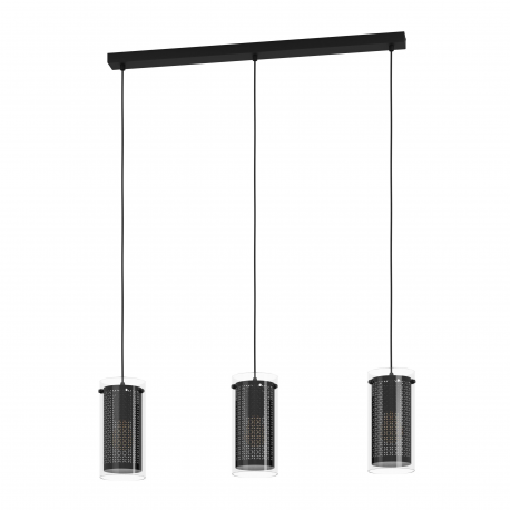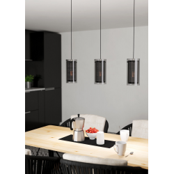 Lampa wisząca PINTO TEXTIL 1 składa się z trzech cylindrycznych szklanych kloszy zawieszonych na długim metalowym daszku tego samego koloru za pomocą czarnych przewodów tekstylnych. Czarny korpus tekstylny po wewnętrznej stronie ma drobne wycięcia, a po włączeniu tworzy fascynującą grę światła i cienia w pomieszczeniu. Dzięki swojemu domowemu wzornictwu lampę wiszącą można łączyć z niemal każdym stylem umeblowania i zapewnia nastrojowe oświetlenie w salonie lub w jadalni, na przykład nad podłużnym stołem jadalnym. Żarówki nie wchodzą w zakres dostawy. Lampa nadaje się do każdej lampy z trzonkiem E27.