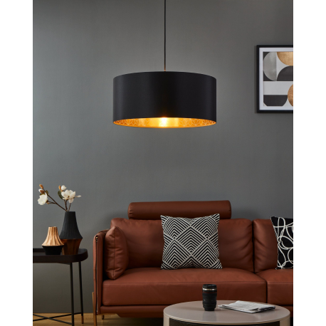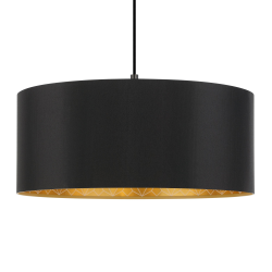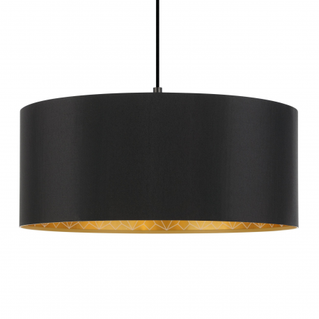 Lampa wisząca z abażurem serii ZARAGOZA. Oprawa z czarnym tekstylnym abażurem, którego wewnętrzna część jest w kolorze złotym, z geometrycznym dekorem. Lampa o średnicy 53 cm sprawdzi się zarówno w sypialni, salonie czy też w kuchni nad stołem. Żródło światła to 1 żarówka na gwint E27 o mocy maksymalnej 40W. Źródło światła nie stanowi zakresu dostawy.