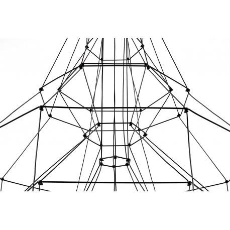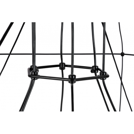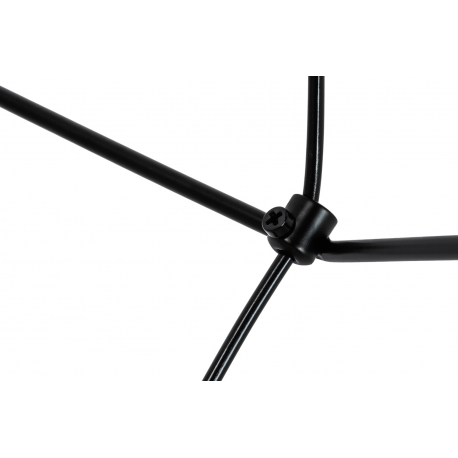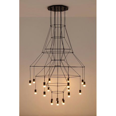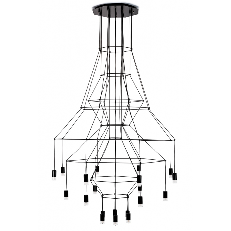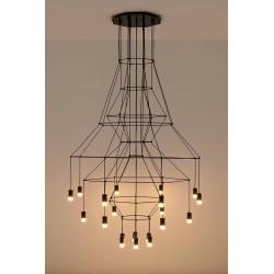 Lampa FLUSSO 20 w kolorze czarnym, została wykonana z przewodów osadzonych na stalowych prętach, które poprzez zagięcia nadają oprawie wyjątkowy kształt. Metalowe klosze skrywające źródło światła wy