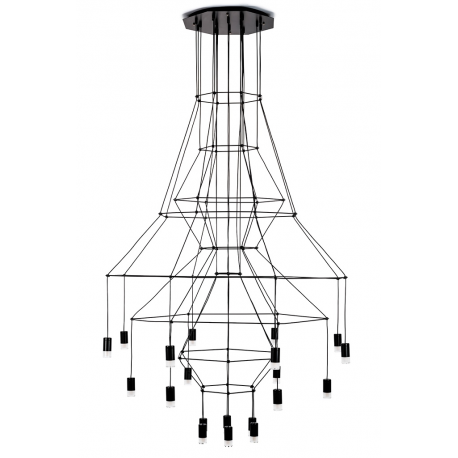 Lampa FLUSSO 20 w kolorze czarnym,została wykonana z przewodów osadzonych na stalowych prętach, które poprzez zagięcia nadają oprawie wyjątkowy kształt.Metalowe klosze skrywające źródło światła wykończone są szkłem satynowym.Geometria w połączeniu z prostą formą daje praktyczną, a także unikatową lampę, która znajdzie swe zastosowanie we wnętrzach w stylu loftowym oraz industrialnym.Światło: 20 x G9 max. 5W Oprawa: wys. 280 cm / szer. 115 cm / gł. 115 cmKlosz: wys. 9 cm / śr. 4 cmMocowanie: wys. 3 cm / szer. 44 cm Montaż: instalacja sufitowa Wymiary opakowania: 115 cm / 115 cm / 12 cm.