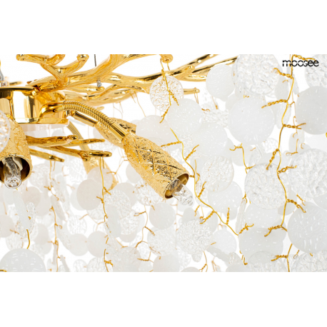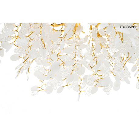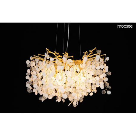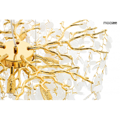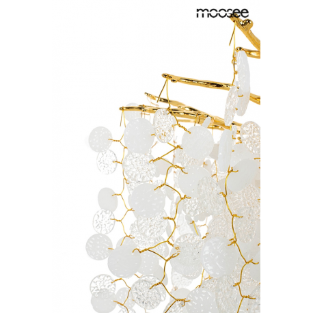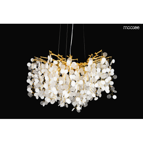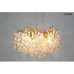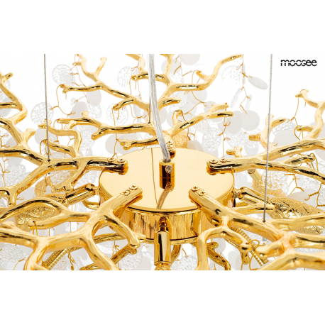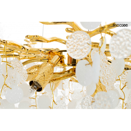 MOOSEE lampa wisząca RIVIERA 60 złotaEkskluzywna i niecodzienna oprawa, która udekoruje Twoje wnętrze.Zbiór wykonanych z pełną precyzją akrylowych kloszy zamontowano na stalowej obręczy w kolorze złotym, imitującej gałęzie drzewa.Wśród kloszy ukryto aż 8 źródeł światła, które pięknie oświetlą przestrzeń i stworzą niesamowity efekt wizualny.Ciekawą funkcją jest też możliwość regulacji kąta nachylenia światła.Riviera to lampa o wielu zaletach, która doskonale sprawdzi się w salonie urody czy restauracji.Światło: 8 x G9 max. 20 WOprawa: wys. 152 cm / szer. 60 cm / gł. 60 cmKlosz: wys. 47 cm / szer. 60 cm / gł. 60 cmMocowanie: wys. 4 cm / śr. 15 cm Przewód: 115 cmMontaż: instalacja sufitowaWaga netto: 11 kgWymiary opakowania: 31 cm / 31 cm / 38 cm.