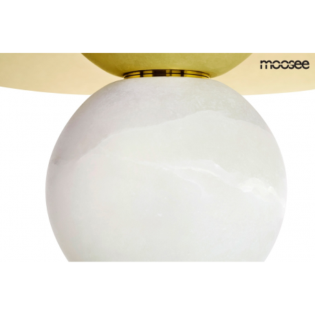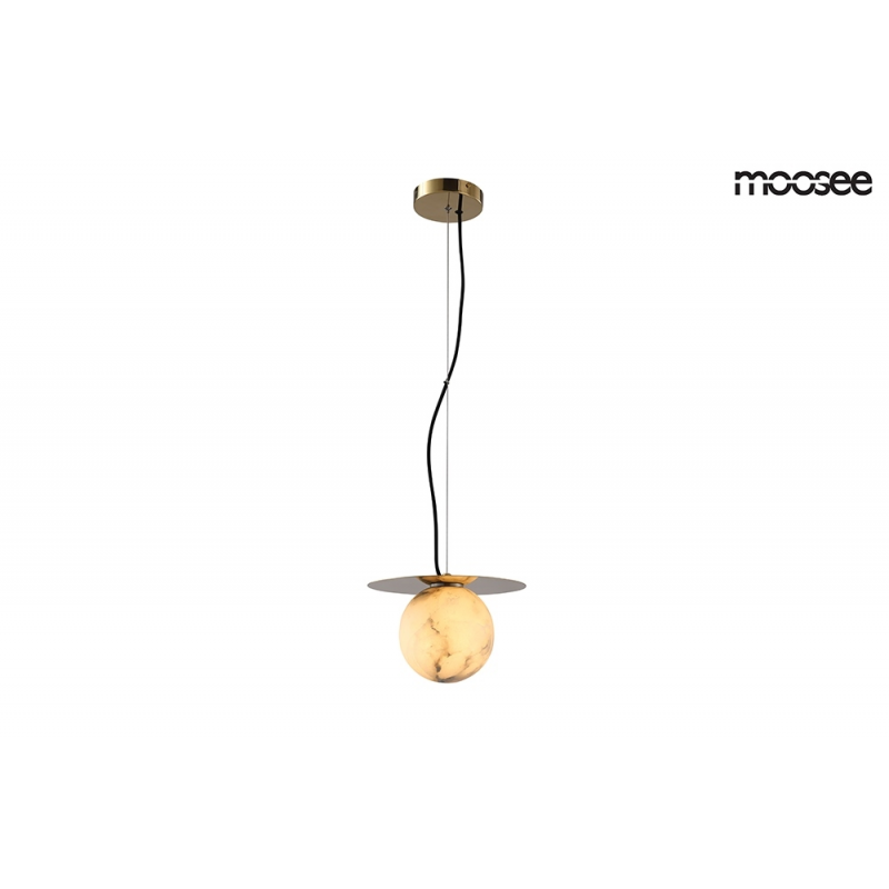 Lampa wisząca HALO od marki MOOSEE. Wykonana została z połączenia stali nierdzewnej w złotym kolorze i kulistego klosza wykonanego z alabastru. Klosz wykonany z mlecznego alabastru, skrywający Ledow