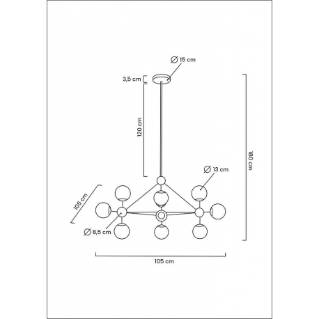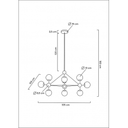MOOSEE lampa wisząca ASTRIFERO 10.Konstrukcja lampy wykonana została z metalu w kolorze złotym.Całość dopełnia 10 okrągłych, szklanych kloszy o bursztynowym kolorze.Do regulacji wysokości oprawy służą 3 metalowe, wkręcane pręty o długościach 2 x 50 cm oraz 1 x 20 cm.Światło: 10 x E27 max 40 W (brak w zestawie)Oprawa: wys. 180 cm / szer. 105 cm / gł. 105 cmKlosza: śr. 13 cmMocowanie: śr. 15 cm / wys.3,5 cmMontaż: instalacja sufitowaWaga netto: 6 kgWymiary opakowania: 79 cm / 35 cm / 29 cm.*W kloszach mogą wystąpić pęcherzyki powietrza, które są naturalnym efektem powstałym podczas ręcznej obróbki szkła.