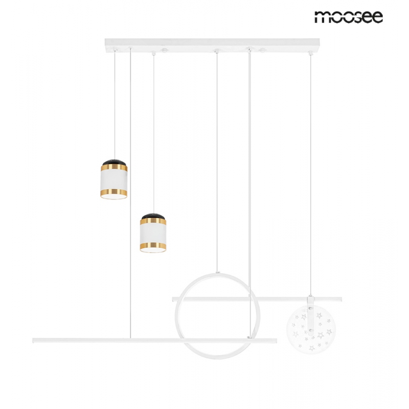 MOOSEE lampa wisząca STARS białaNowoczesna propozycja dla osób, które chcą wprowadzić oryginalność do swojego wnętrza.Metalowa konstrukcja z wbudowanymi, niezależnymi od siebie źródłami światła zapewni delikatne i dekoracyjne oświetlenie.Gwieździsta projekcja jest główną ozdobą oprawy, a jej intensywność zależy od wysokości zawieszenia.Uniwersalny biały kolor ze złotymi akcentami idealnie sprawdzi się w pokoju dziecięcym.Światło: LED 46W / 3680 lm / 3000 KOprawa: wys. 230 cm / szer. 85 cm / gł. 8 cmKlosz okrągły LED: śr. 25 cm / gr. 2 cm / dł. przewodu: 200 cmKlosz z gwiazdkami: wys. 12 cm / śr. 8 cm / dł. przewodu: 180 cm i 170 cmKlosz poziomy z kołem gwiazdki: wys. 1 cm / szer. 50 cm / gł. 3 cm / śr. koła: 15 cm / dł. linki: 197 cmKlosz poziomy: wys. 1 cm/ szer. 70 cm / gł. 2 cm / dł. linki: 178 cmMocowanie: wys. 3,5 cm / szer. 65 cm / gł. 6 cmMontaż: instalacja sufitowaWaga netto: 2,5 kgWymiary opakowania: 76 cm / 31 cm / 14 cm.