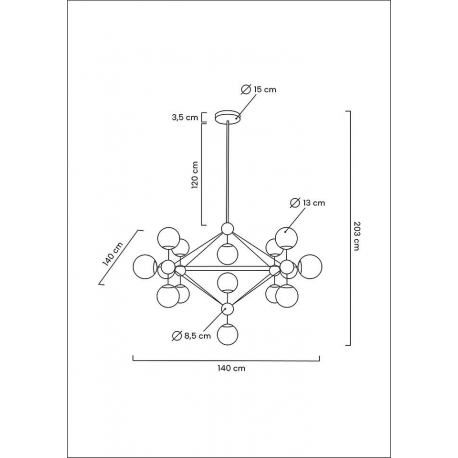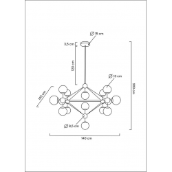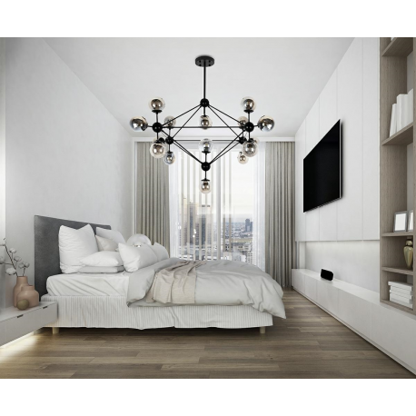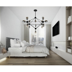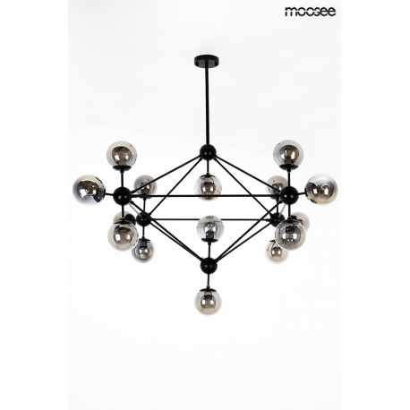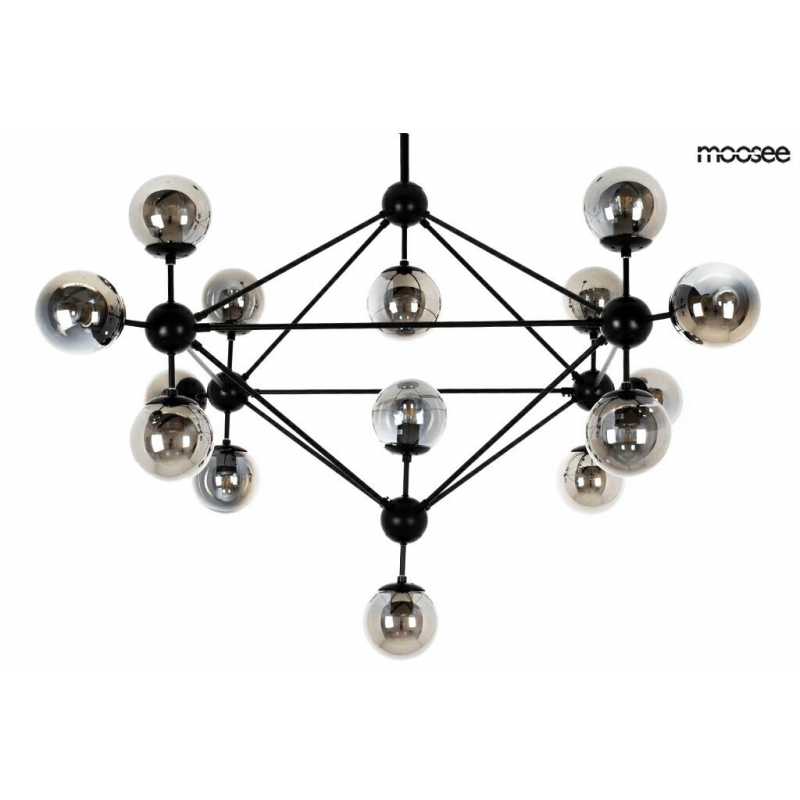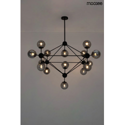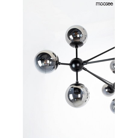 MOOSEE lampa wisząca ASTRIFERO 15.Konstrukcja lampy wykonana została z metalu w kolorze czarnym matowym.Całość dopełnia 15 okrągłych, szklanych kloszy o dymionym kolorze.Do regulacji wysokości oprawy służą 3 metalowe, wkręcane pręty o długościach 2 x 50 cm oraz 1 x 20 cm.Światło: 15 x E27 max. 40 W (brak w zestawie)Oprawa: wys. 203 cm / szer. 140 cm / gł. 140 cmKlosz: śr. 13 cmMocowanie: śr. 15 cm / wys. 3,5 cmRamiona:: 4 x wys. 57 cm / 8 x 44,5 cm / 1 x 6 cmElement mocujący: wys. 120 cmMontaż: instalacja sufitowaWaga netto: 8 kgWymiary opakowania: 79 cm / 50 cm / 29 cm.*W kloszach mogą wystąpić pęcherzyki powietrza, które są naturalnym efektem powstałym podczas ręcznej obróbki szkła.
