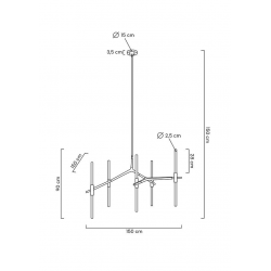 MOOSEE lampa wisząca CANDELABR 10 złota.Niebanalna i nowoczesna propozycja oświetlenia o ciekawym kształcie.Asymetryczne ułożenie oprawy z możliwością regulacji kloszy i ramion.Konstrukcja lampy została wykonana z metalu, a wymienne źródło światła osłania dziesięć szklanych, podłużnych kloszy.Światło: 10 x G9 max. 5 W (brak w zestawie)Wymiary: wys. 150 cm / szer. 150 cm / gł. 150 cmOprawa: wys. 90 cm / szer. 150 cm / gł. 150 cmKlosz: wys. 28 cm / śr. 2,5 cmMocowanie: śr. 15 cm / wys. 3,5 cmRegulacja wysokości: 1 x 22 cm / 1x 33 cmWaga netto: 8 kgWymiary opakowania: 143 cm / 82 cm / 13 cm.