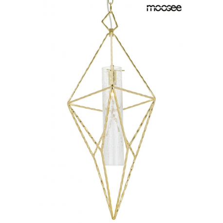 Lampa wisząca HAVANA L od marki MOOSEE. Geometryczną konstrukcję wykonano z połączenia metalu w kolorze złotym i szklanego klosza. Klosz otoczony jest geometrycznym stelażem. Całość została umieszcz