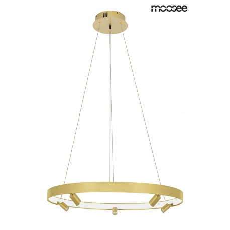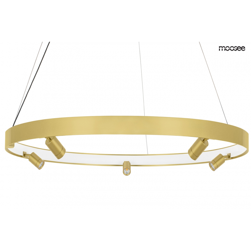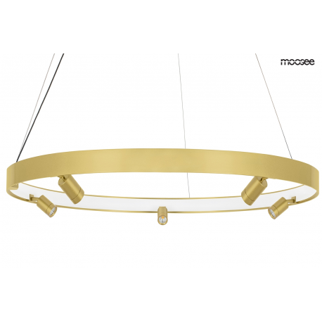 MOOSEE lampa wisząca CIRCLE SPOT 98 GOLD. Wykonana została ze stali nierdzewnej w kolorze złotym. Okrągły klosz pod akrylową osłoną skrywa ledowe źródło światła. Oprawa jest wzbogacona pięcioma doda