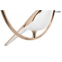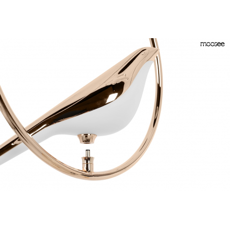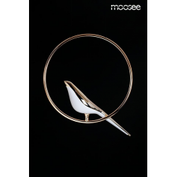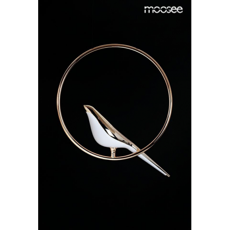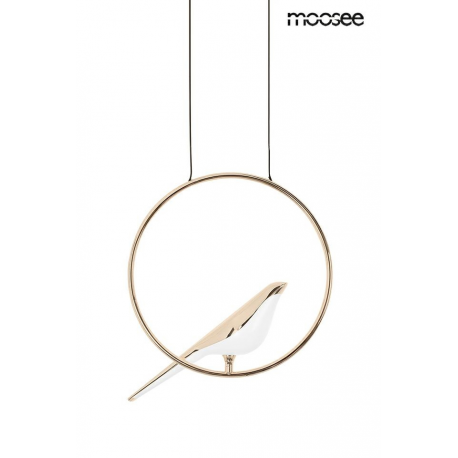 MOOSEE lampa wisząca BIRD złota. Designerski motyw lampy wykonany z połączenia akrylu i metalu w nowoczesnej kolorystyce. Biało-złoty ptaszek zawieszony na złotym okręgu został zamocowany czarnym pr