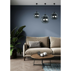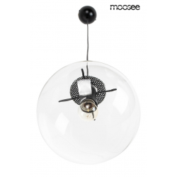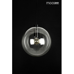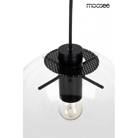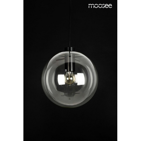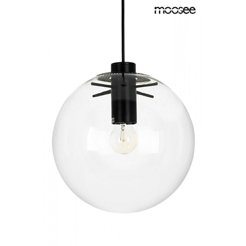 MOOSEE lampa wisząca SANDRA 30 czarna. Okrągły klosz całkowicie wykonano z transparentnego szkła. Wewnątrz klosza na stelażu z czarnego metalu zawieszone jest źródło światła. Lampa jest przeznaczona