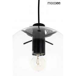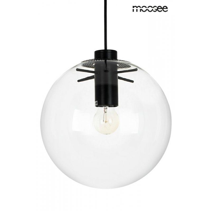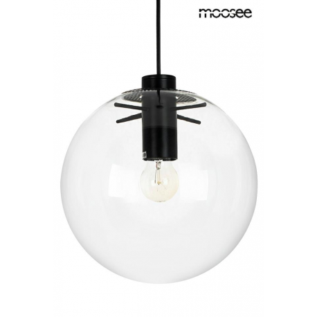 MOOSEE lampa wisząca SANDRA 35 czarna. Okrągły klosz całkowicie wykonano z transparentnego szkła. Wewnątrz klosza na stelażu z czarnego metalu zawieszone jest źródło światła. Lampa jest przeznaczona
