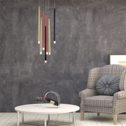 Wyjątkowy design lampy wiszącej Lungo 7 opiera się na zestawieniu różnorodnych kolorów - złotego, czerwonego i czarnego - tworząc harmonijną kompozycję. Ta elegancka lampa wisząca nie tylko nadaje wnętrzu wyjątkowego charakteru, ale także staje się centralnym punktem aranżacji, przyciągając uwagę swoim wyjątkowym stylem. Każdy z metalowych kloszy zakończony jest transparentną końcówką, która pięknie rozprasza i zmiękcza światło.
