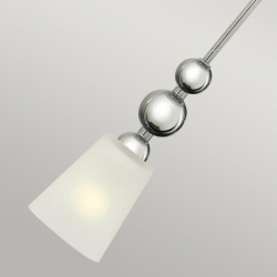 Urzekająca sylwetka lampy z kolekcji Zelda przywołuje klimat lat 50., czarując metalowymi kulami, których rozmiar stopniowo rośnie w dół, tworząc elegancką kolumnę środkową. Zgrabnie odgięte prostokątne ramiona podtrzymują klosze z trawionego szkła, których półkoliste podstawy dodają serii wyjątkowego stylu retro. Dostępne są dwa warianty wykończenia — polerowany nikiel oraz vintage mosiądz, co pozwala dostosować oświetlenie do różnych aranżacji i gustów.