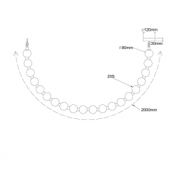 Wymiary: Lampa posiada długość 2 metrów. Wysokość lampy reguluje się za pomocą odpowiedniego rozstawu podsufitek. Średnica kloszy wynosi 8 cm.