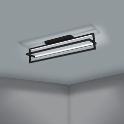 Lampa sufitowa LED SIBERIA jest wykonana z czarnego metalu z dwoma prostokątnymi i zagnieżdżonymi profilami LED. Profil poziomy można obracać. Zainstalowane na stałe diody LED pod osłonami z białego tworzywa sztucznego zapewniają przyjemne światło zgodnie z życzeniem i są niewidoczne. Ponadto dołączony pilot umożliwia ściemnianie, zmianę temperatury barwowej pomiędzy ciepłą białą, neutralną białą i zimną białą oraz ustawienie nocnego światła i timera. Dzięki minimalistycznemu i nowoczesnemu wzornictwu lampa sufitowa oferuje stylowe oświetlenie każdego pomieszczenia – czy to w kuchni, salonie, sypialni, przedpokoju, jadalni czy biurze.