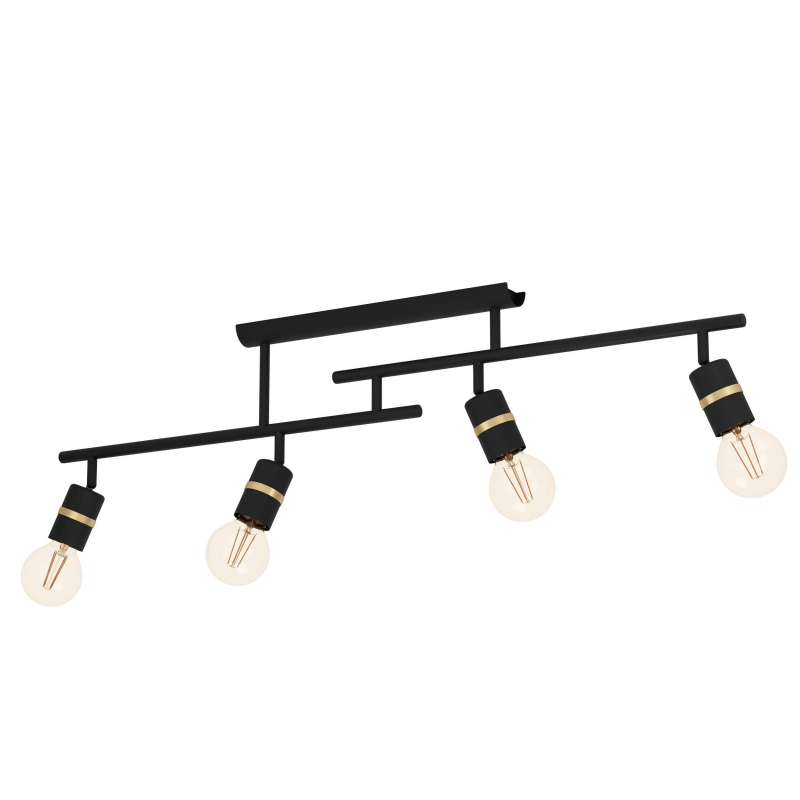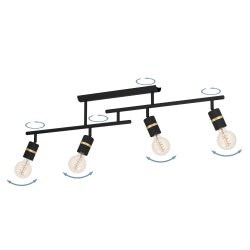 Lampa LURONE ma czarną metalową osłonę, na której zawieszono dwa podłużne metalowe ramiona tego samego koloru z czterema ruchomymi metalowymi reflektorami. Pierścienie w kolorze mosiądzu na głowicach punktowych nadają lampie nowoczesny wygląd. Lampa wisząca wtapia się w różne style wyposażenia i daje możliwość ustawienia indywidualnych akcentów w pomieszczeniu - czy to w salonie, czy w jadalni nad stołem jadalnym. Przedstawione żarówki żarowe nie wchodzą w zakres dostawy. Lampa nadaje się do każdej lampy z trzonkiem E27.