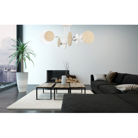 ZITA to nowoczesna lampa sufitowa o oryginalnej formie. Jej geometryczne koła przyciągają uwagę, a dzięki drewnianym elementom wnętrze staje się ciepłe i przytulne. Doskonały wybór dla osób poszukujących wyjątkowych rozwiązań. Ta lampa ożywia przestrzeń i nadaje jej charakteru. Jednocześnie doskonale spełnia swoją funkcję i pięknie doświetla pomieszczenie. Dostępna w wersji czarnej lub białej, to polski produkt gwarantujący doskonałą jakość wykonania.